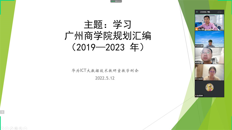 为鼓励促进各部门与广大教职工,尤其是青年教师,积极融入太阳成集团tyc41183发展,并提高公司教职工队伍的整体教学、科研、管理能力,产出高水平的教学、科研成果,提升公司的学术水平和影响力,推动公司硕士学位授予单位和团队建设工作,结合公司实际,2022年5月12日16:00-17:30,华为信息与网络技术公司大数据技术教研室在腾讯会议开展全体学习座谈会。本次座谈会由大数据技术教研室主任卢鹏主持,大数据技术教研室专任教师全体参与此次座谈会,共计6人。