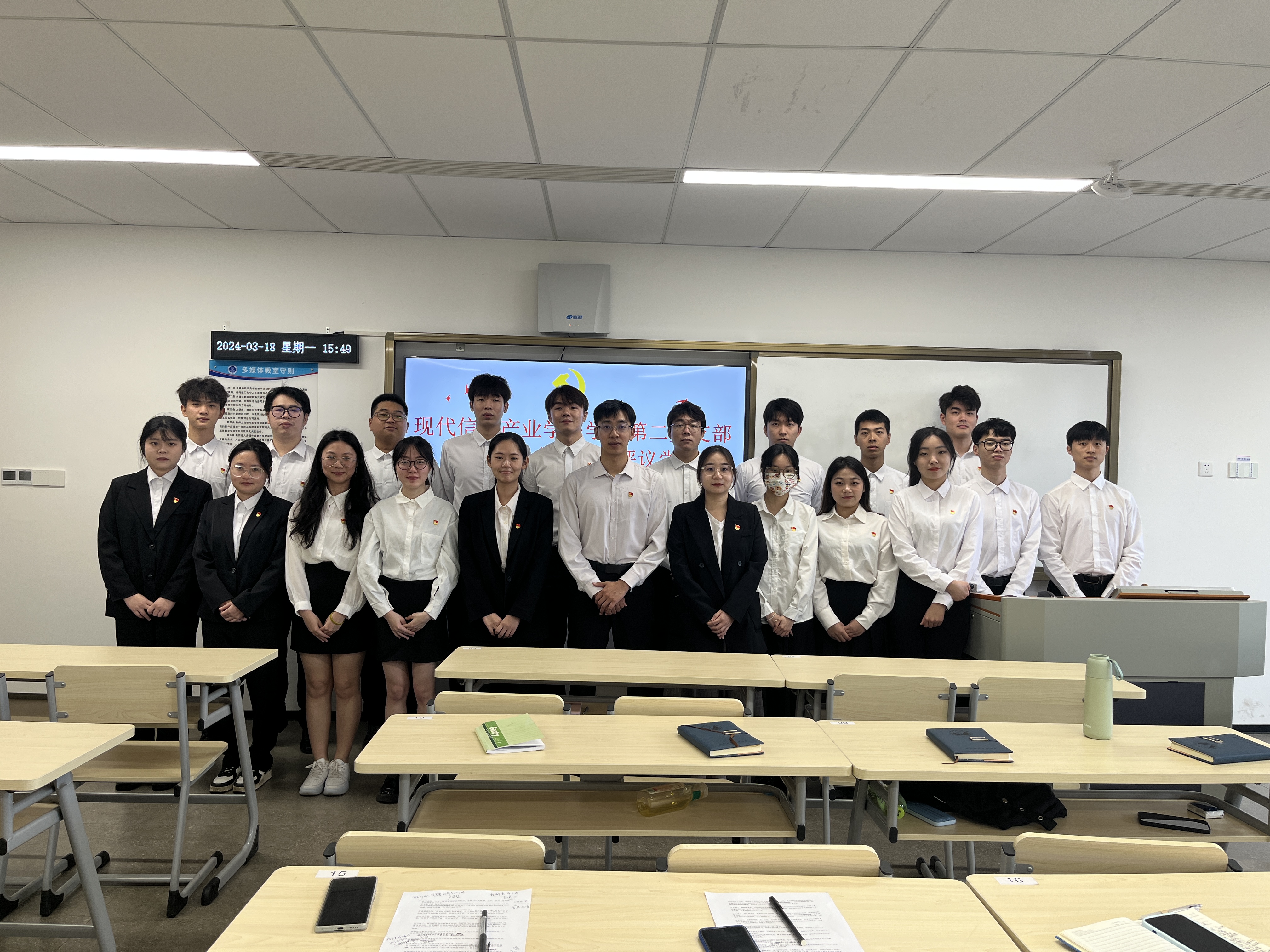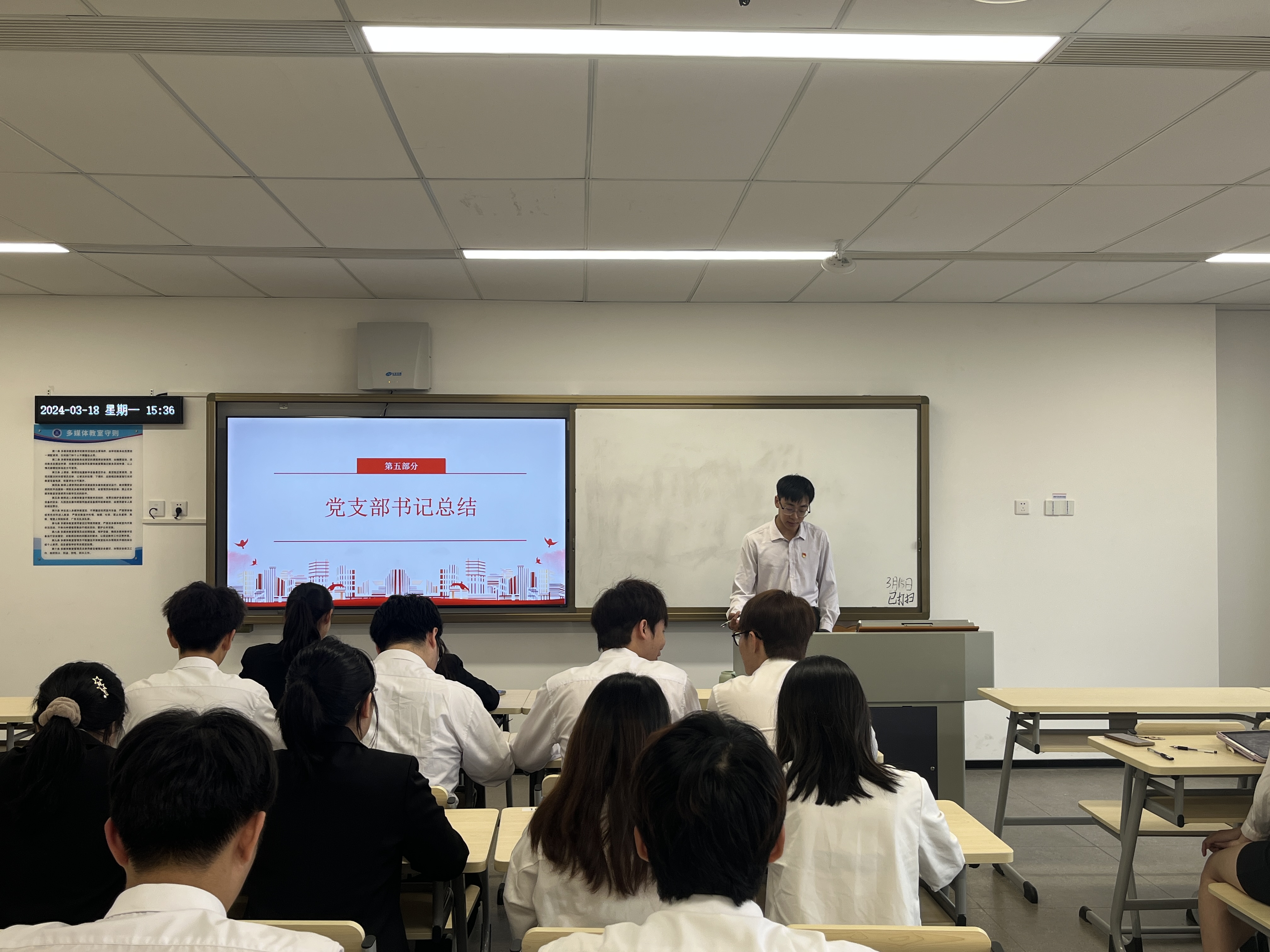 会议尾声,胡富铭对全体党员提出三点要求:一是要坚定理想信念,始终保持对党的忠诚;二是要努力学习专业知识,不断提升个人的素质;三是要积极地投身到社会实践活动当中去锤炼意志。他寄予三点期望:第一,希望大家发挥党员的先锋模范作用,带动周围的同学共同的进步;第二,增强团队意识,积极参与支部建设,贡献自己的力量;第三,保持谦虚谨慎的态度,不断自我完善,时刻保持清醒。