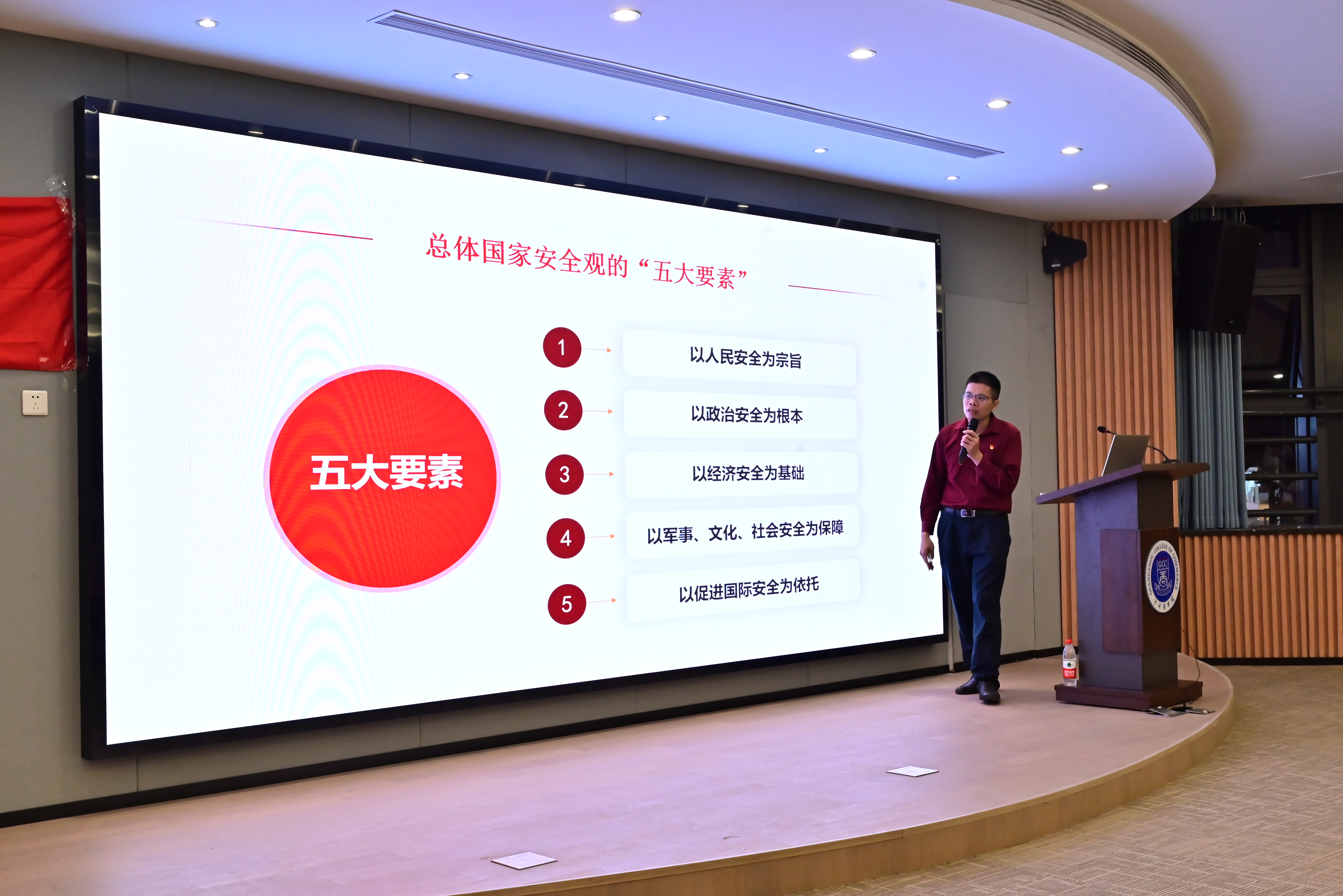 伍有才引用习近平总书记在中国共产党第二十次全国代表大会上的报告中“国家安全是民族复兴的根基,社会稳定是国家强盛的前提”,向学员们表达了国家安全的重要性,并详细讲述了总体国家安全观的“五大要素”,引导学员们深入了解总体国家安全观。