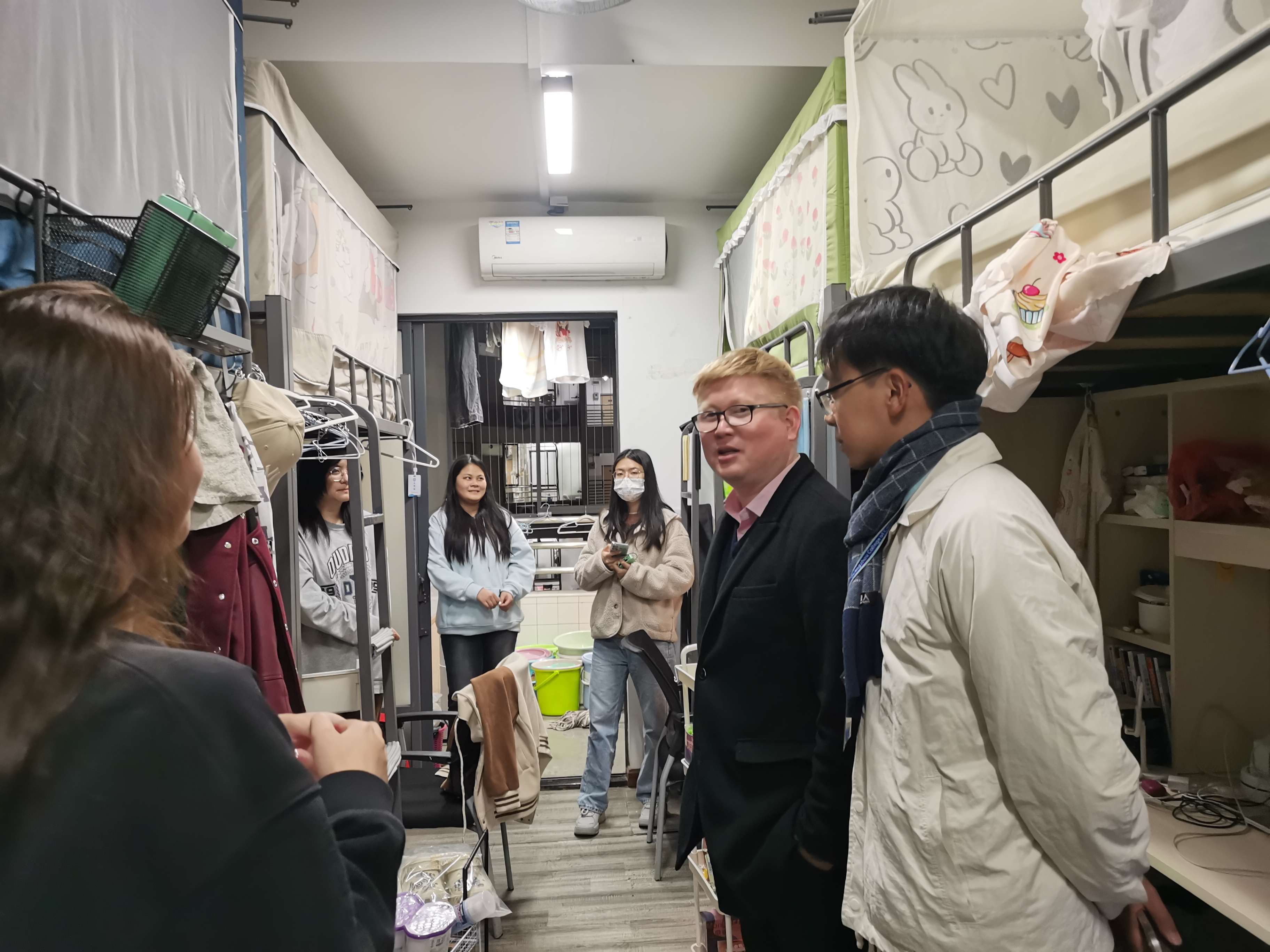 新学期即将开始,为进一步加强宿舍安全管理,营造良好安全的生活环境,2月25日晚公司党总支书记、副经理关树基及2023级辅导员胡富铭、邬子君、张家欣、陈淑美进行宿舍走访,了解同学们在寒假期间的各项情况,倾听员工需求,并送上新学期的美好祝愿。