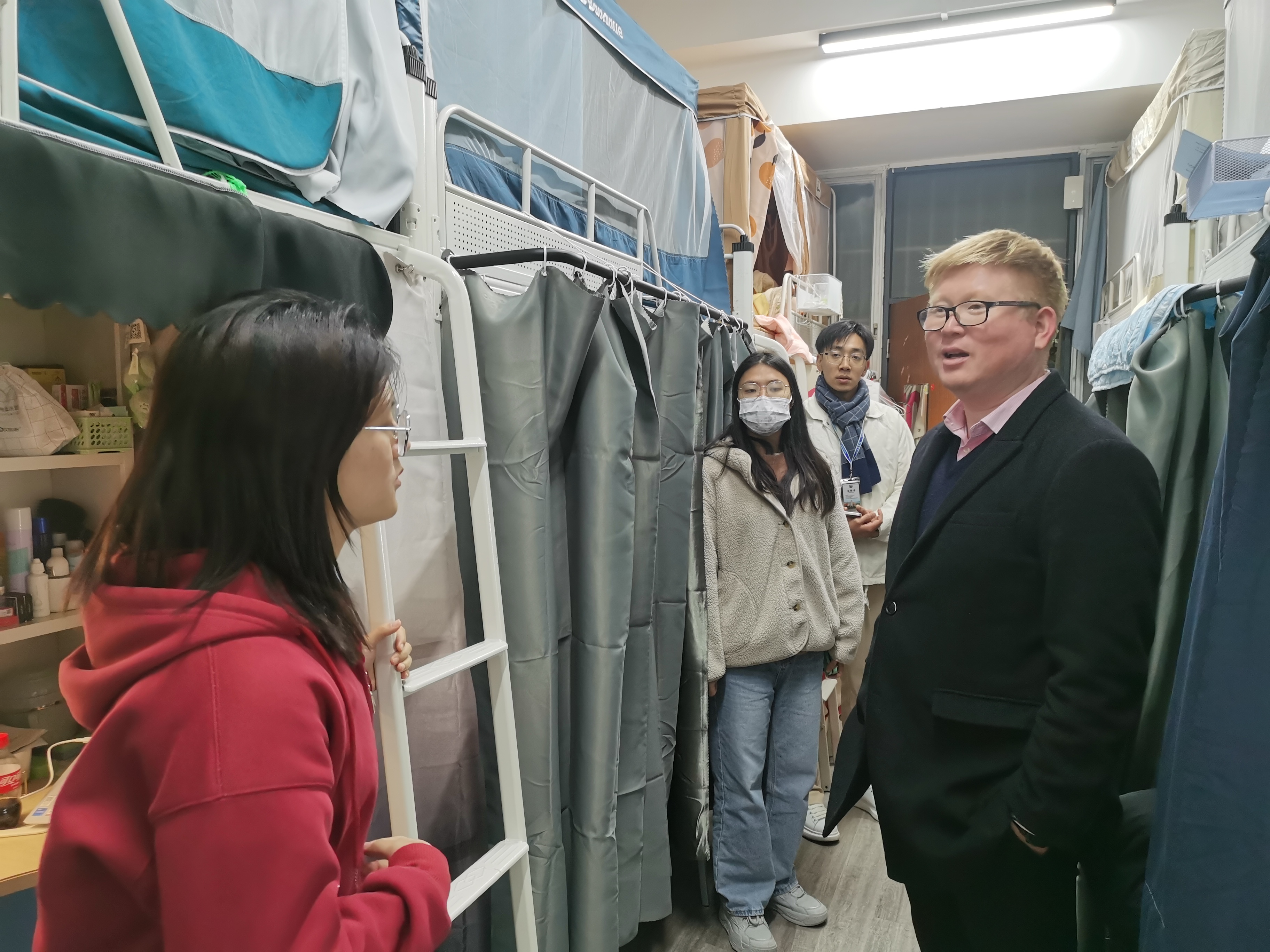 在检查走访过程中,关树基深入员工宿舍,与同学们亲切交流,关怀员工生活,了解员工寒假学习情况并询问同学们新学期的学习目标,细心叮嘱同学们注意宿舍卫生和宿舍安全。他强调,新学期到来,同学们要努力提高自我管理能力,养成良好的学习、生活习惯。