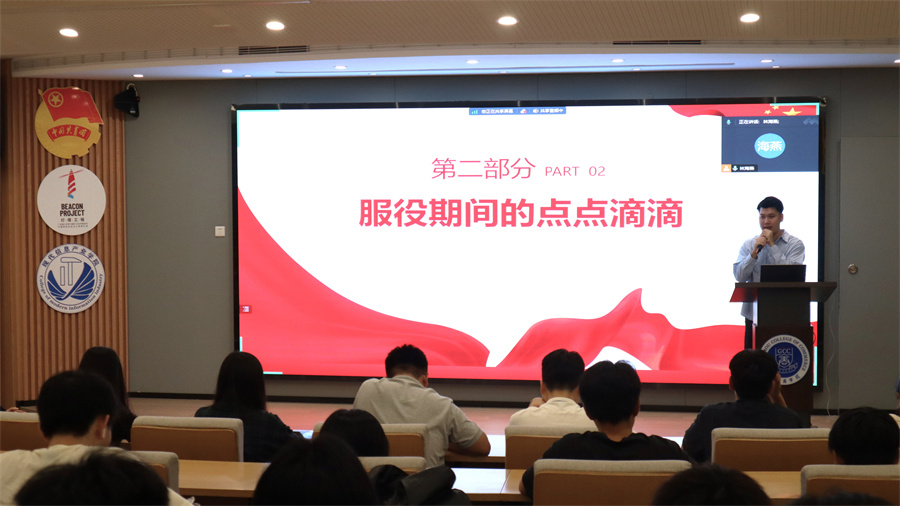 毕业后积极投身西部建设的吴美仪员工,分享其服务西藏林芝市的工作经历与体验。她从“为什么参加西部计划”“如何参加西部计划”“在西部计划中的生活趣事和工作日常”,详细地讲解了在西部计划基层工作中的所见所闻、所思所想、所获所得。她鼓励同学们在毕业后勇挑时代重担,为国家和社会发展贡献青春力量。