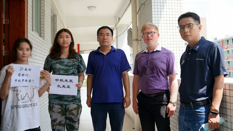今夜月明人尽望,不知秋思落谁家。为让留校军训员工在中秋节能感到家的温暖,9月19日下午,华为ICT公司执行经理张志峰,副经理李绍强,公司党总支书记、副经理关树基,辅导员许丽琴、司徒洛琳、蔡柳渊和胡富铭为同学们送去了节日最真挚的问候和月饼,为军训新生送去温暖与祝福。