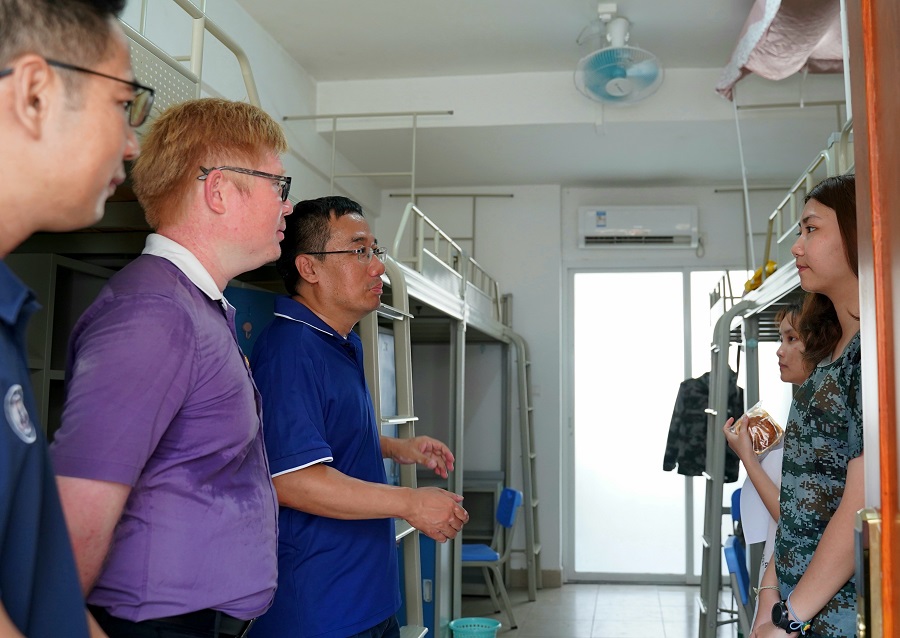 另外,在新生辅导员的陪同下领导们来到军训场地进行走访,并对军训员工进行慰问鼓励。在慰问走访过程中,院领导对军训的新生致以诚挚的关怀以及问候。他们详细地了解新生军训工作进展情况,并与教官和新生亲切交流,不仅对教官们的辛勤劳动表示感谢,也对新生们给予了充分鼓励。同时,他们十分关心新生们的身体健康情况,叮嘱新生辅导员要留意新生的身体情况,做到掌握情况、做好登记、及时解决员工的困难,尽量避免在气温最高的时段进行训练,并叮嘱员工要按时休息,科学作息。