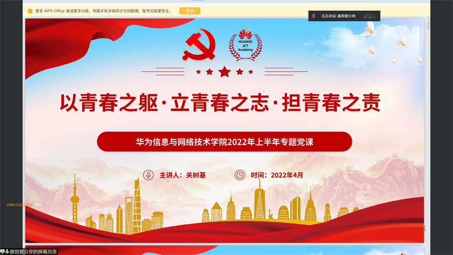 为加强对入党积极分子的培训,提高入党积极分子学习党章党规和最新指导思想的能力,帮助入党积极分子进一步向党组织靠拢。4月24日晚,华为信息与网络技术公司党总支在腾讯会议开展2021-2022学年度第二期分党校学员培训班第一讲,本次党课采用线上授课的方式开展,由华为信息与网络技术公司党总支书记、副经理关树基主讲。员工党支部党员、分党校培训班学员共计49人参与此次课程。